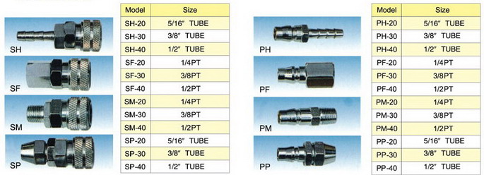 The S/P pneumatic couplers are of Japan standard, we have material of steel, stainless steel and zinc, of which steel pneumatic couplers are most normal. This kind of pneumatic couplers are of good quality with very good prices, very popular most in South-east Asia market. The S/P type pneumatic couplers are wildly used together with tubing, air guns to finish some function.