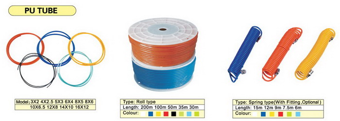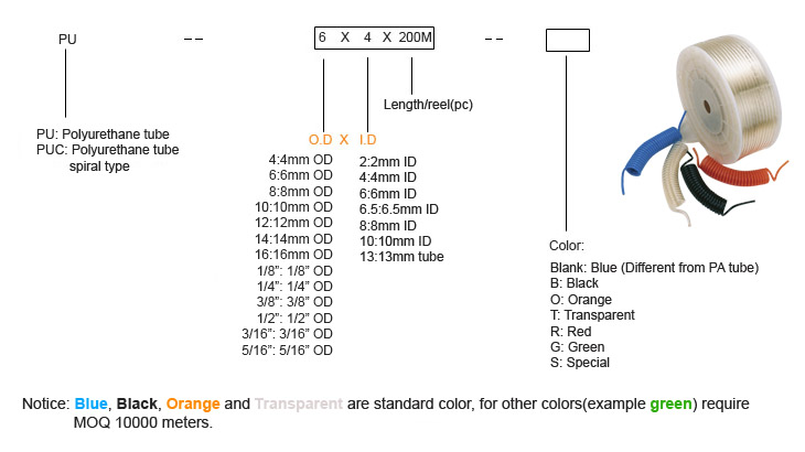 The polyurethane tubing (PU tube) normally has blue, black, orange 3 color, there're other sizes like yellow, green, red, etc. for optional.