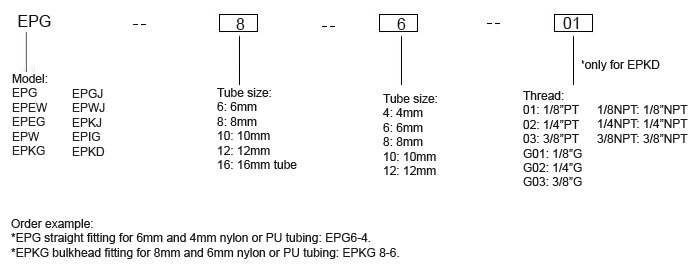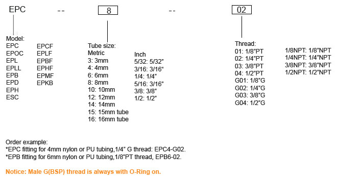 For plastic pneumatic fittings with one tubing connection and one thread connection, or several tubing connection in same size and one thread connection, please follow “How to order?” as below to get correct code: