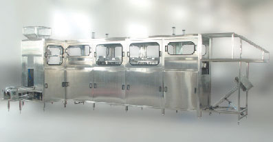 This production line is specially designed to produce 3-, 5-gallon barreled drink water, whose production capacity ranges from 80 to 1200 barrels per hour. It integrates barrel washer, filler and capper into one unit. And this series production line can automatically carry out the functions of washing, sterilizing, filling, capping, barrel counting and discharging. It is a new kind of barreled water auto-producing line, and it integrates mechanism, electronics and pneumatics into one unit.